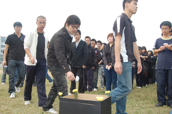 29日下午1点,学院足球场西南角,一百多名广电专业的同学们,身着黑色上衣,胸前佩戴一朵小白花,表情肃穆,面对宝塔河的方向,为他们的师弟、他们那两个或许还没有见过面的师弟——何东旭、方招及长大的陈及时举行了简单而又庄重的追悼仪式。