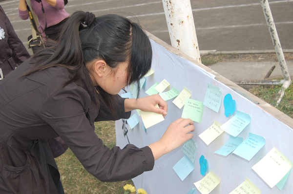 仪式中,“我宁愿你们默默无闻的活着”、“你们永远活在我们广电专业人的心中”、“学弟,你们是最棒的,一路走好!”一张张温馨而又美好的祝福小字条贴满了整个留言板。“尽管我们点了蜡烛为他们祈祷,放了孔明灯为他们祝福,但这还远远不够,远远不能够表达我们作为广电人对英雄的敬意。”鲁文博同学满怀深情的声音让在场所有人再次为英雄们的无畏、英勇、大爱而动容,现场不少女生眼圈已经湿润。