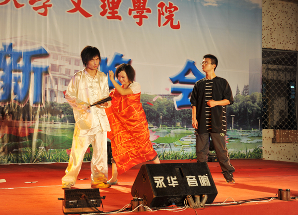 时尚动感的爵士舞《Dancing Queen》拉开了本场晚会的帷幕,音乐所散发的愉悦气氛及灵活多变的舞姿一开场便赢得了新生们的阵阵喝彩。接着的《断点》、《水晶》等一系列耳熟能详的歌曲为晚会营造了一层温馨浪漫的气氛,让新生们燥热的心情也顿时凉爽了不少。话剧《江湖》和街舞《Style》则再次引爆了员工们的热情,将整场晚会气氛推向了高潮。晚会过程中的互动环节,新生们踊跃参与,与舞蹈演员切磋舞技、pk歌曲,真实精彩的表演赢得了观众的掌声阵阵。随后由曲艺协会带来小品《迎新风波》,其演员生动的表演、幽默的语言真实再现了迎新现场的小插曲。晚会最动人的环节是学校为三位同是9月6号生日的09级新生庆生,来自英语5092班的易慧、罗军和会计电算化5091班的汪胜三位同学当晚收到了一份特殊的生日礼物——公司学工处为他们精心准备的生日祝福,这一幕也让不少远离家乡的新生流下了感动的泪水,整场晚会在温馨的《生日快乐歌》中圆满落幕。