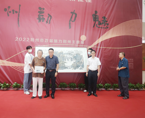 开幕式上,荆州市美协艺术家唐和先生向公司捐赠了一幅高2.3米,宽1.15米的中国画《群山荟萃》,公司党委书记朱继平为唐和先生颁发收藏证书。