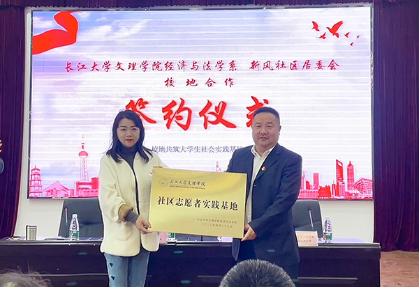 本网讯 近日,经济与法学系和新风社区居委会校地合作签约仪式在社区居委会会议室举行。经法系党总支副书记杨杉杉和新风社区居委会负责人代表单位签订了校企合作框架协议,经法系向新风社区授予“社区志愿者实践基地”牌匾。此次签约授牌为校地双方提供了进一步交流合作的平台,有利于经法系员工在课余走出校园、走进社会、服务地方,获得锻炼和成长。经法系辅导员和一批志愿者、新风社区工作人员参加活动。(图文由经法系提供)