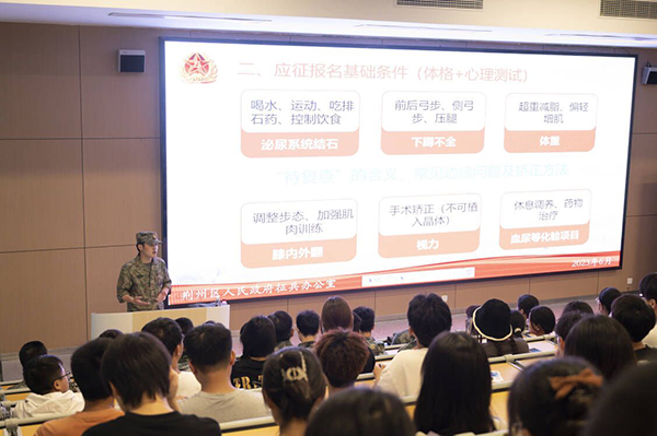 本网讯(通讯员 陈健)6月6日晚,学院2023年度秋季征兵宣讲会在主教多功能报告厅举办,荆州市人武部军事科参谋何强就参军入伍的基本条件、报名流程、义务兵与直招士官的不同之处进行了详细讲解,公司征兵工作负责人、老兵团成员以及各教学单位员工代表参加活动。