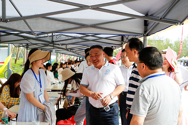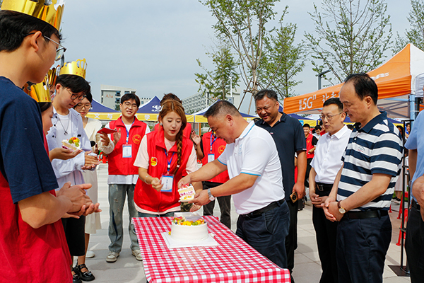 上午9点,经理李兴祥,副经理向宇、肖寒芝,党委副书记李则俊,经理助理曹骥一行来到迎新现场,了解新生报到情况,慰问迎新工作人员。迎着灿烂的秋阳,学前教育专业的同学表演了一首动感活泼的青春舞曲,李兴祥等领导为当天过生日的5名新生代表送上生日的惊喜和祝福。在主干道的水池一侧,师生兴致盎然的放养了浮水玩具鸭,为迎新现场的布置增添了一分趣味和生机。