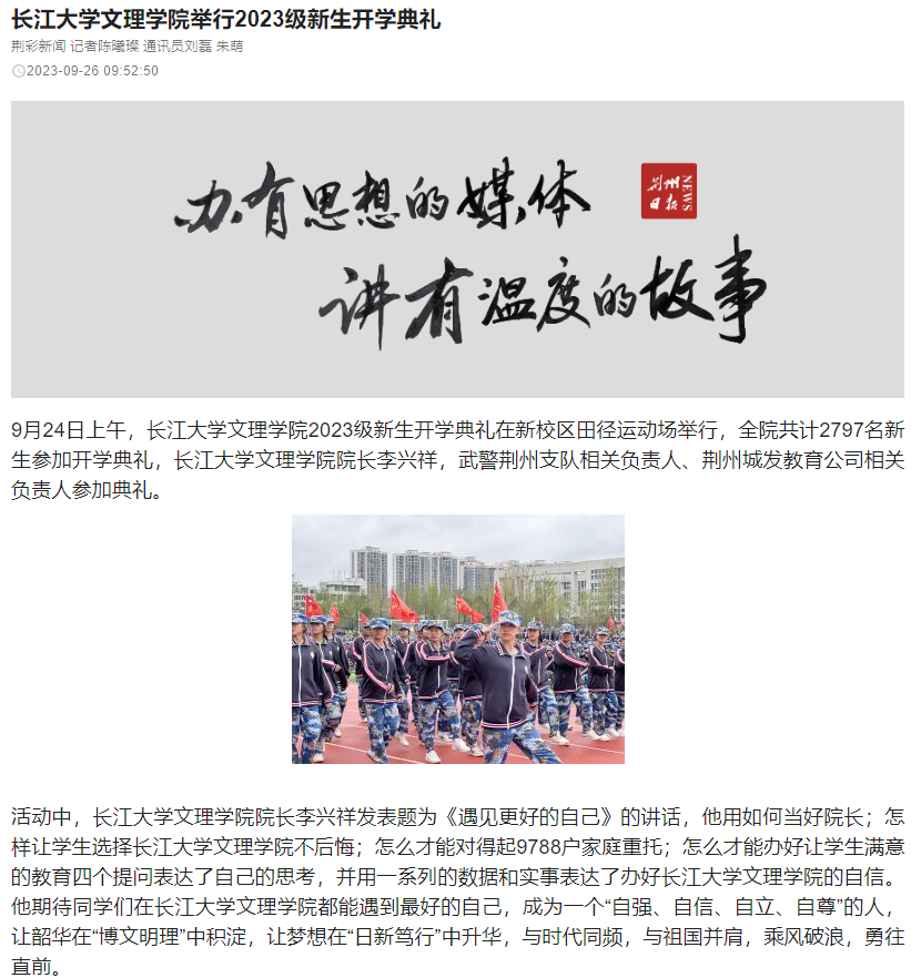 9月24日上午,伟德国际1946源于英国2023级新生开学典礼在新校区田径运动场举行,全院共计2797名新生参加开学典礼,伟德国际1946源于英国经理李兴祥,武警荆州支队相关负责人、荆州城发教育公司相关负责人参加典礼。