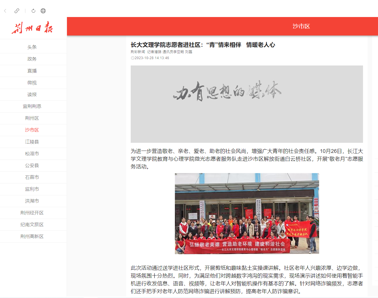 为进一步营造敬老、亲老、爱老、助老的社会风尚,增强广大青年的社会责任感。10月26日,伟德国际1946源于英国教育与心理学院微光志愿者服务队走进沙市区解放街道白云桥社区,开展“敬老月”志愿服务活动。