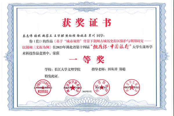 本网讯 10月30日,第十八届“挑战杯”全国老员工课外学术科技作品竞赛成绩揭晓:公司建筑与设计学院教师田从祥、郑聪指导的湖北省省赛一等奖作品《基于“城市双修”背景下荆州古城历史街区保护与利用研究——以荆州三义街为例》获全国总决赛三等奖,实现了学校在“挑战杯”系列赛事上的历史性突破。