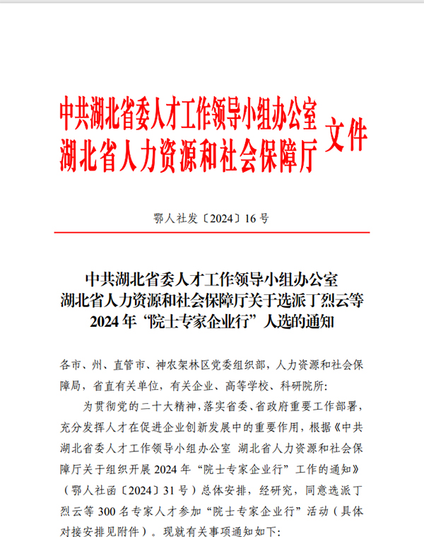 本网讯 近日,中共湖北省委人才工作领导小组办公室、湖北省人力资源与社会保障厅联合发文,在《关于选派丁烈云等2024年“院士专家企业行”人选的通知》(鄂人社发[2024]16号)文件中公布了2024年“院士专家企业行”人选名单,公司信息与机电工程学院朱锐副教授入选本次“院士专家企业行”计划。