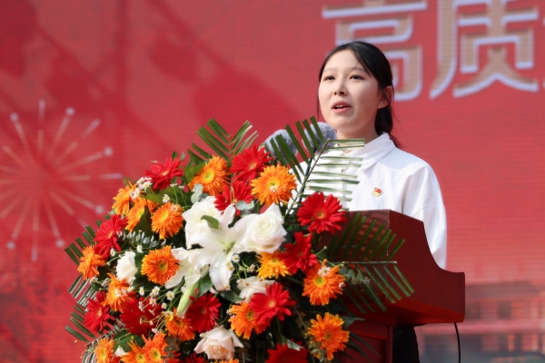 员工代表、学院2023-2024学年国家奖学金获得者、人文与传媒学院中师5211班白夕萍同学发言。她说,在文理,我们是幸运的一代,在新的校园环境和最好的人生舞台上,我们将珍惜大学的每一分每一秒,勇敢追梦,收获成长,书写绚丽的青春篇章。