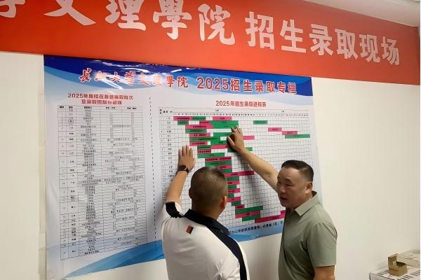 李兴祥认真听取了招生处工作汇报,并现场查阅2025年招生录取实时进度表,他充分肯定了现阶段招生工作取得的成绩,公司今年提前批录取分数线再创新高:湖北艺术类综合分超省控线69.6分(2024年为52.4分),体育类综合成绩超省控线76.5分(2024年为71.75分)均列省内同类高校第一。