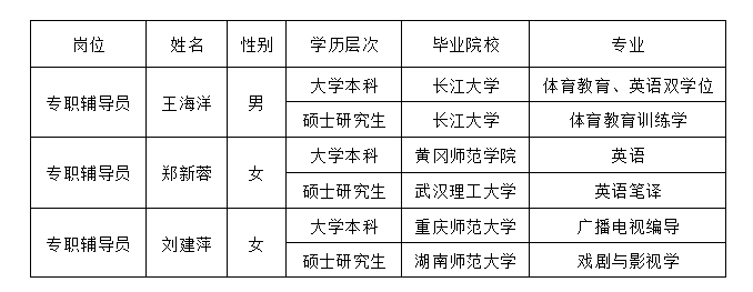 2017年10月15日,公司组织了专职辅导员招考工作,经笔试、面试及考核小组评议,公司党政联席会研究,现将通过本次考核人员名单及信息公示如下: