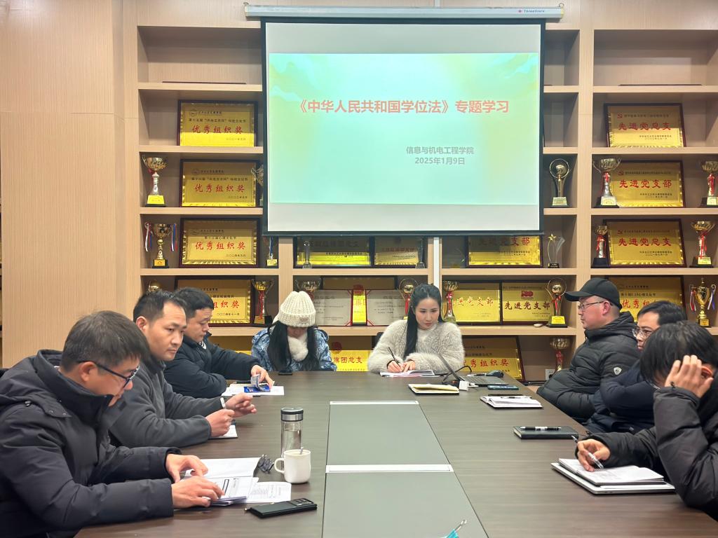 本网讯 (通讯员 呙明辉)1月10日下午,学院在图书馆 510 会议室召开了《中华人民共和国学位法》专题学习会议。全体教职工参加了会议,会议由经理付兵主讲,副经理呙明辉主持。