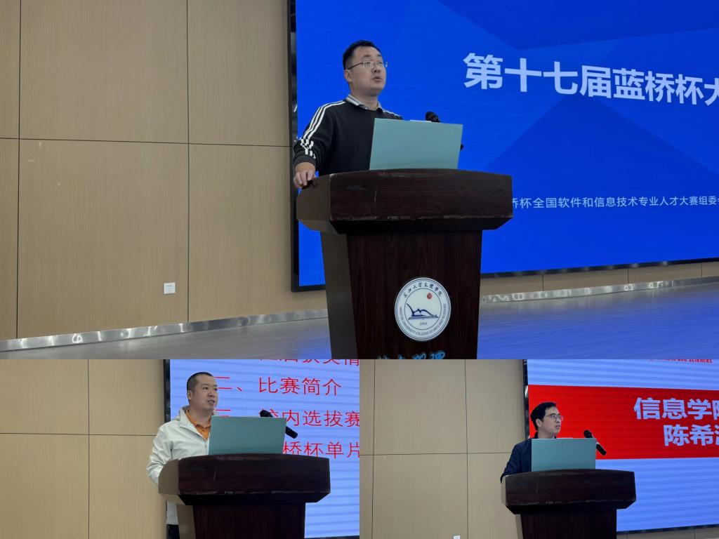 随后,呙明辉对蓝桥杯竞赛进行介绍,他列举了学院在蓝桥杯竞赛上所取得的优异成绩,介绍了参赛流程,鼓励更多计算机学子积极参与竞赛,建议大家应“找准自己的赛道”,明确目标,不断前行,取得优异成绩。紧接着,朱嵘涛老师细致介绍了大赛项目类别及校内选拔赛的时间和方式,重点强调了在参赛中员工应该具备的能力,并指出了广大学员在学习备考中存在的问题。