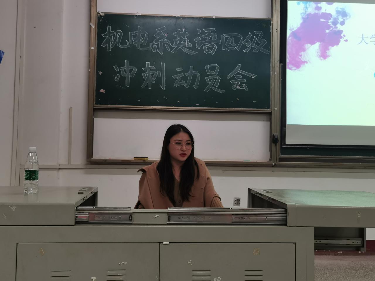 本网讯(员工记者 谢东环)为了帮助同学们更好的应对进入大学后的第一次英语四级考试,增强考试信心,11月16日晚,在西校区四教200教室,我系开展2019级英语四级冲刺动员会。大会由秘书处柴璇主持,辅导员燕梦蝶担任主讲人,2019级全体同学参加。