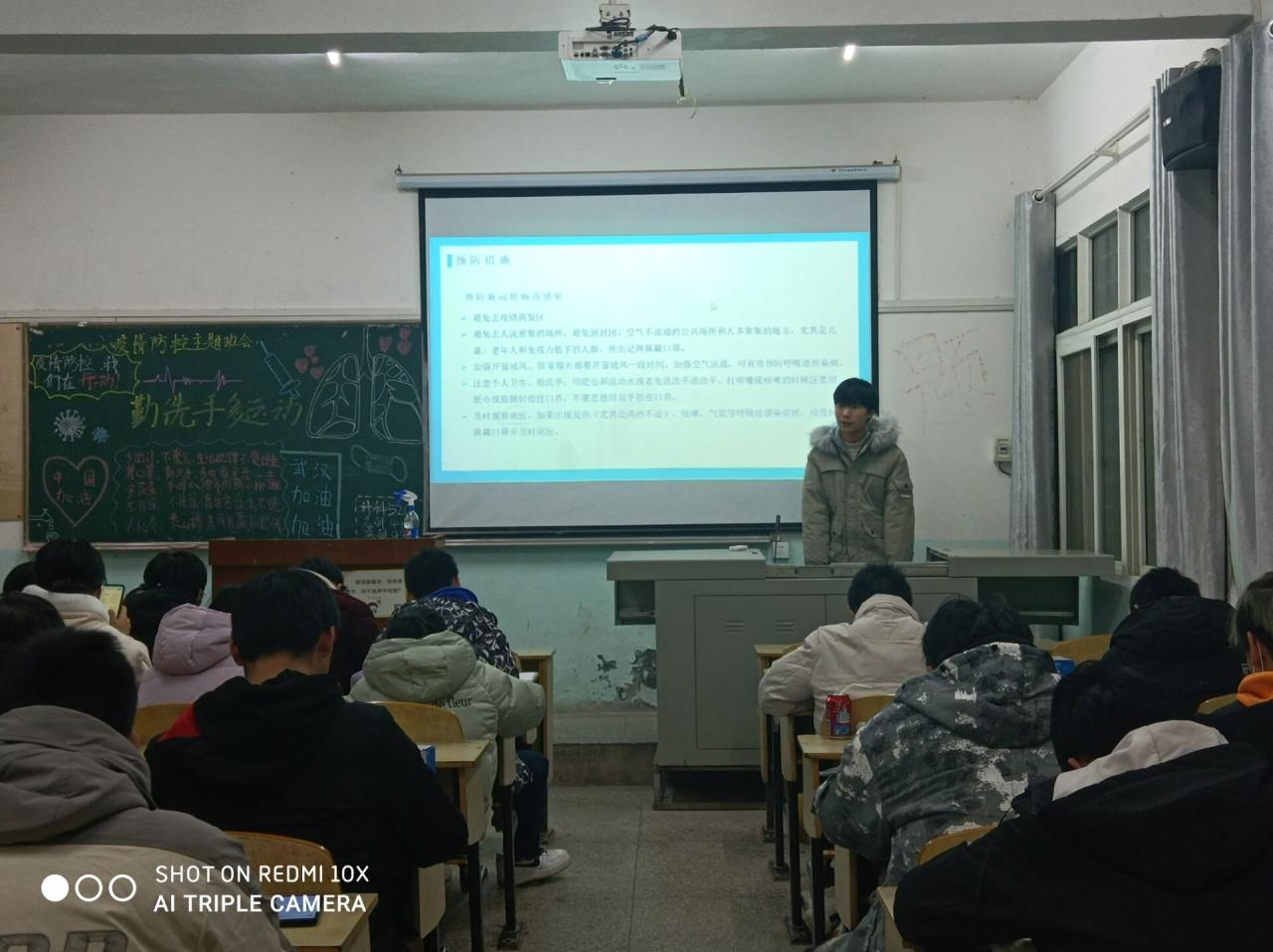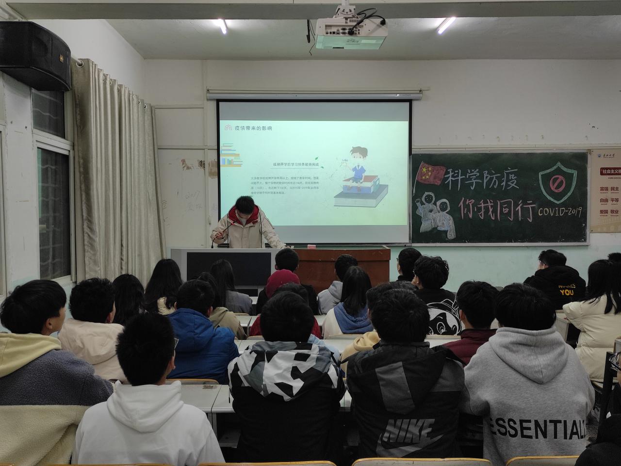 班会上,主持人结合PPT,以“校园疫情防控工作”为主题向同学们分析并总结了疫情的现状、疫情防控工作安排和疫情防控成果。他表示疫情还未过去,我们每个人都应该保持严格的防护措施,不能掉以轻心,要认真落实学院疫情防控常态化的相关要求。随后,他向同学们讲解了荆智通出行码的注册和使用以及乘坐交通工具期间的防疫注意事项,希望同学们在校园中时不点外卖、佩戴口罩、保持距离、室内勤换气通风。