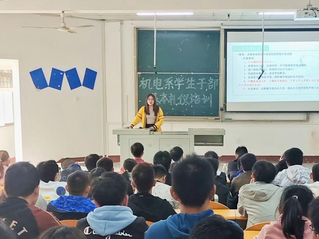 本网讯(员工记者 付思进 湛点)10月27日中午,在西校区四教200室,我系开展员工干部基本礼仪培训活动。活动由秘书处夏书侨主持,系辅导员燕梦蝶主讲,系辅导员成观雄、朱亦丹出席,团学组织全体成员参加。
