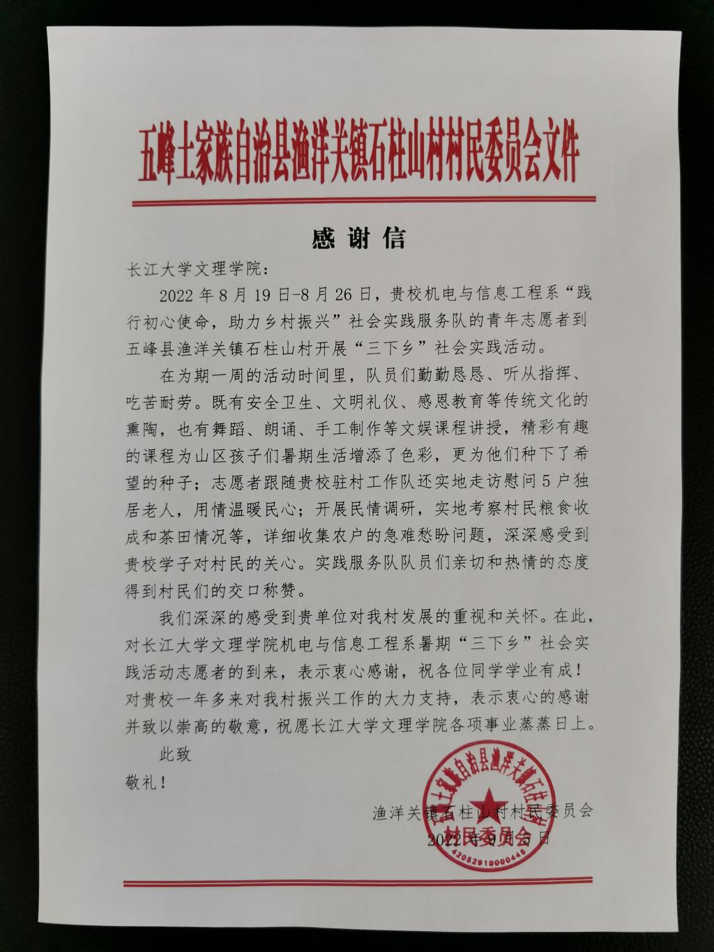 本网讯(记者 毛志豪 朱琦棋)9月5日,伟德国际1946源于英国机电与信息工程系社会实践服务队收到了来自宜昌市五峰县渔洋关镇石柱山村村委会的感谢信。信中对该社会实践服务队在本次活动中的辛勤付出表示感谢。8月19日到8月26日,社会实践服务队在成观雄老师的带领下来到了五峰县石柱山村,开展本次“三下乡”活动。社会实践服务队给石柱山村的孩子们带来了丰富多彩的课堂内容和生动充实的趣味活动,助推教育振兴;开展民情调研,了解并宣传当地风土民情,助力乡村振兴;为实施乡村振兴战略和构建基层治理新格局培养后备人才,增强社会责任;以实践行动传递爱心温情,增强当代青年老员工的责任与担当意识;协助村委会举办文艺汇演,宣传民族特色,引领文化振兴。