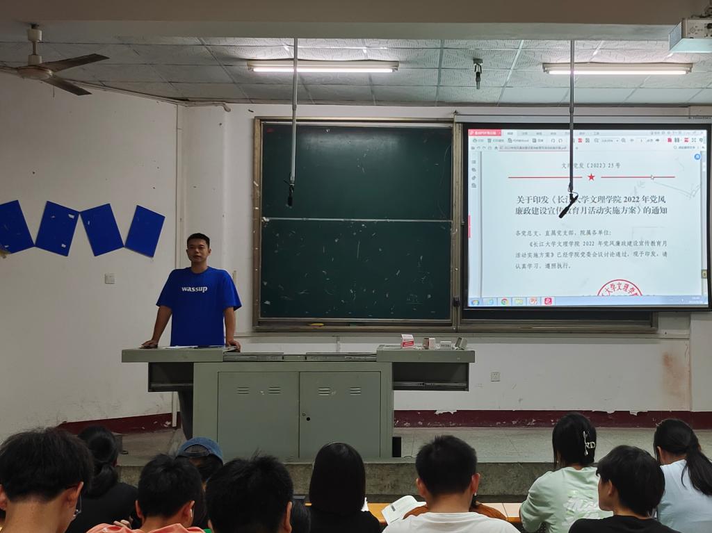 班会开始,主持人通过放映PPT,围绕“警示教育”、“担当实干精神”、“纪法条例学习”、“清廉校园建设”四个方面,要求员工干部们切实履行工作职责,勇于奋斗担当,不怕困难挫折。辅导员希望同学们规范自身行为,强化理论学习,树立正确的世界观、人生观、价值观,严格遵守党纪和国家法律法规。