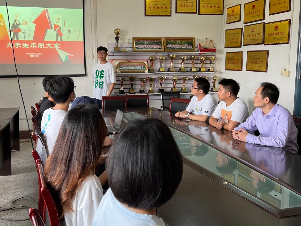 本网讯(员工记者 吴家佳)为帮助老员工树立正确的择业观,拉近员工与职场的距离,9月30日,我系在系会议室开展“才聚荆楚·勇往职前”湖北省老员工求职大赛系部预选赛。比赛由辅导员燕梦蝶主持,系党总支书记吴海良、辅导员成观雄、朱亦丹担任评委,我系2023届部分毕业生参加。
