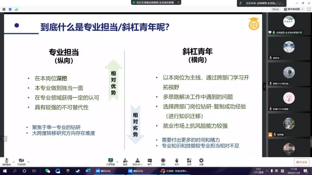 本网讯(员工记者 吴家佳)11月4日,在腾讯会议平台上,我系开展2023届毕业生空中宣讲会。会议由系辅导员燕梦蝶主持,特别邀请欣旺达、湖北三宁、益海嘉里、博众精工四个公司的主讲人到我系开展宣讲会,系党总支书记吴海良、辅导员燕梦蝶、朱亦丹出席,2023届全体毕业生参加。