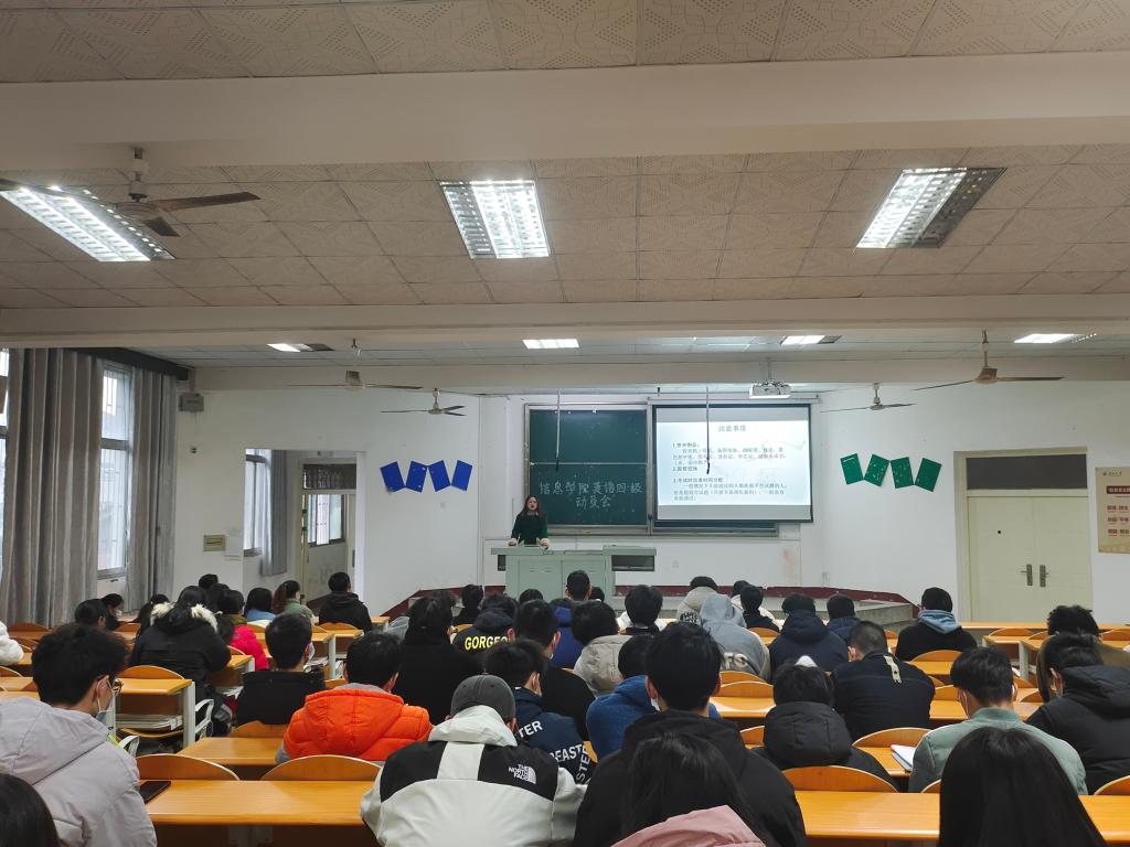 本网讯(员工记者 李学哲)为进一步强化考风考纪教育、明确英语学习的重要性,12月1日下午,公司于西校区四教200教室开展大学英语四六级考前动员大会。大会由秘书处王子瑞主持,特别邀请电信5201班张依格分享四级备考经验,辅导员燕梦蝶出席,2021级全体员工参加。