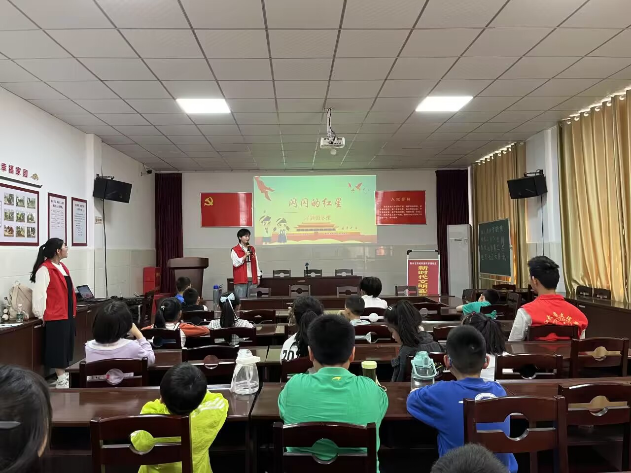 书法课上,志愿者们认真教小朋友们书写姿势,带领小朋友们学习了一些简单的字和诗句,并讲述基本的笔画要领。历史课上,志愿者通过介绍革命书籍《闪闪的红心》,向小朋友介绍了小英雄潘东子的故事。热血感人的事迹使小朋友们深受启发,他们励志要努力学习,发愤图强,争做共产主义接班人。活动结束,志愿者们与小朋友合影留念。