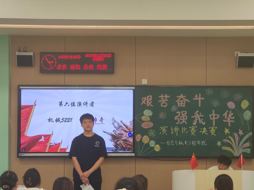 比赛开始,主持人致开幕词。参赛选手们伴随着背景音乐,声情并茂地讲述了自己关于“艰苦奋斗,强我中华”的心中感想,每一位参赛同学都以饱满的热情与昂扬的精神状态投入到自己的演讲故事中,一篇又一篇发自内心的深情演讲使人受益匪浅。经过一个半小时的激烈角逐,最终计算机5223班张恒荣获一等奖,计科s5222班李毅、计科s5222班王崇林荣获二等奖,计科s5221班文雪梅、机械5221班杨帅奇、物理5221班李芃辉荣获三等奖。