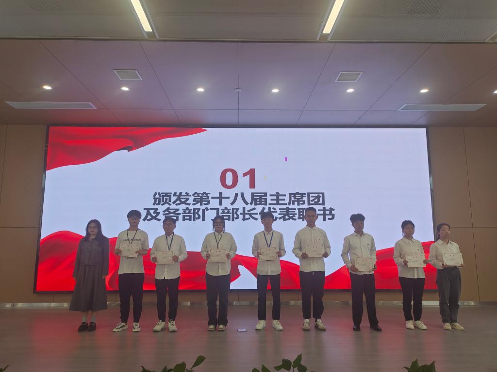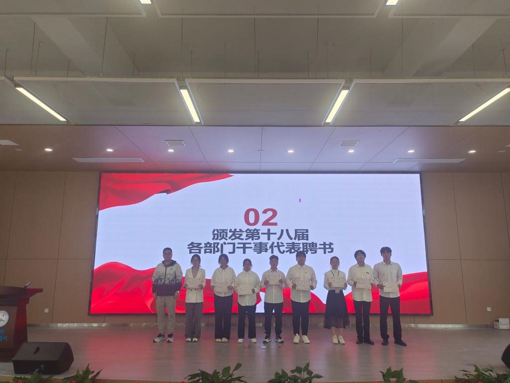 随后,王大专老师宣读第十九届员工干部名单,陈晓倩老师、王妍柳老师、杨阳老师和韩雪莹老师共同为新任主席团和新任部长授予工作牌。新任员工干部代表王盛博向大家分享他的工作经验和志愿活动经验,并鼓励大家积极参加志愿活动,勇担时代责任;学工队伍老师代表燕梦蝶希望员工会全体成员以一名优秀员工干部的标准为准绳,发挥好先锋模范作用;王大专老师寄语员工会全体成员谦以待人、敢于请教,多多吸取前人经验,努力提高个人修养和个人素质。
