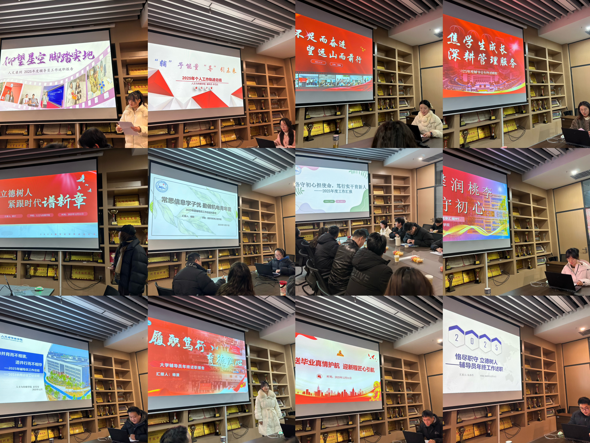 在交流分享环节,来自四个院系的12位辅导员老师依次作主题交流。梁玥老师以《仰望星空 脚踏实地》为题,分享了如何在理想信念引领中扎根实际工作,做到思想有高度、行动有根基;邵宇老师围绕《立德树人——紧跟时代谱新章》,探讨了在新时代背景下如何创新育人方式,落实立德树人根本任务;彭军军老师以《万物并育而不相害,道并行而不相悖》为引,阐述了在多元文化背景下促进员工和谐发展、包容成长的实践思考;李艺欣老师以《“辅”予能量,“导”引未来》为题,强调辅导员应成为员工的能量补给站与成长引路人,助力员工全面成长;杨阳老师以《常思信息学子忧,勤做机电青年需》为题,结合工科员工特点,分享了精准把握员工需求、服务员工发展的具体做法;杨漫老师以《履职笃行 育德润心》为题,汇报了如何通过体育育人载体,锤炼员工意志品质,实现德体融合;宋静静老师以《知不足而奋进 望远山而前行》为主题,反思工作短板,明确进步方向,展现了持续自我革新的职业追求;王妍柳老师以《恪守初心担使命,笃行实干育新人》为题,系统回顾了在思想引领、日常管理、精准帮扶等方面的务实举措与育人成效;聂志老师围绕《送毕业真情护航 迎新程匠心引航》,聚焦毕业生工作,分享了在就业指导、员工联络、育人延续方面的经验;赵伟薇老师以《聚焦员工成长 深耕管理服务》为题,阐述了精细化、人性化员工管理服务的理念与实践;韩雪莹老师以《德馨润桃李 育人守初心》为题,强调以德立身、以德施教,在潜移默化中引导员工树立正确价值观;最后朱亦丹老师以《恪尽职守 立德树人》为题,表达了坚守岗位职责、践行育人使命的决心与思考。12位老师的汇报各有侧重、各具特色,既有对日常工作的梳理总结,也有对难点问题的深入思考,更有对未来工作的规划展望。
