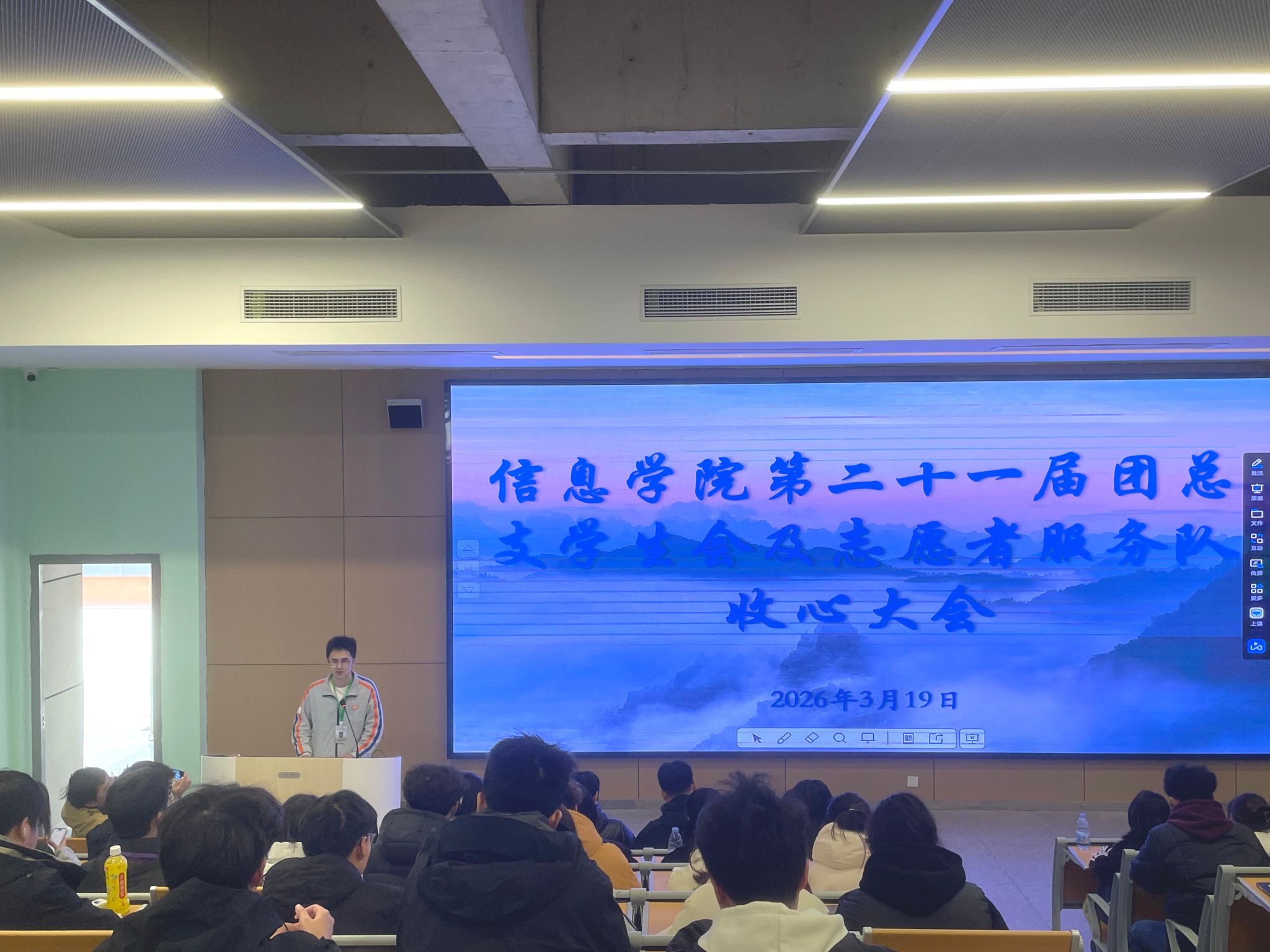 本网讯(通讯员 孙齐/文 邓永源 柴懿航/摄)3月19日下午,学院第二十一届团总支员工会及志愿者服务队收心大会在教学楼B-214顺利召开。本次会议由院员工会综合办公室郑毅主持,公司党总支副书记王大专老师出席会议,第二十一届团总支员工会及志愿者服务队全体成员参会。