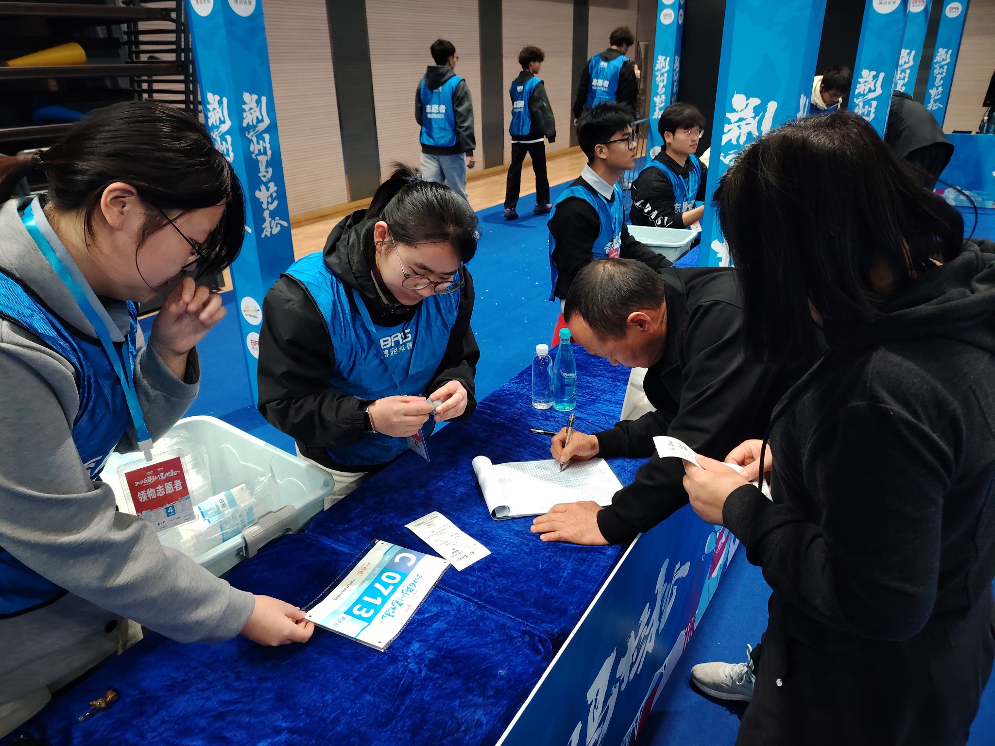 为全力保障赛事顺利进行,40 名志愿者早早抵达指定岗位,分驻20个号码布发放窗口,以饱满的热情、专业的态度迎接每一位参赛选手。志愿者们严格遵循“凭小票取号”的原则,全程坚守岗位,将选手号码布整齐摆放,确保存取流程高效有序。面对选手们的各种问题,志愿者们耐心解答,确保每位选手都能顺利拿到自己的号码布。在分发过程中,志愿者们分工明确、配合默契,高效有序地完成了任务。他们用温暖的笑容和贴心的服务,让参赛选手感受到了荆马赛事的关怀与热情。