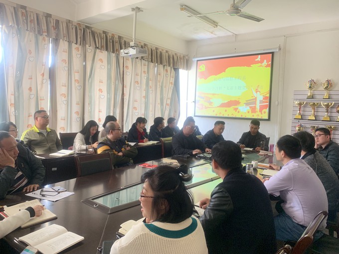 首先,全体教职工在教工党支部书记朱锐的带领下,集体学习了习近平新时代中国特色社会主义思想,主要内容包括:《习近平总书记在“学校思想政治理论课教师座谈会”上的重要讲话精神》,《中共教育部党组关于加强和改进高校领导干部深入基层联系员工工作的通知》,《关于坚持和发展中国特色社会主义的几个问题》,《第十三届全国人民代表大会第二次会议政府工作报告内容》,陈理谈《习近平扶贫论述摘编》等。