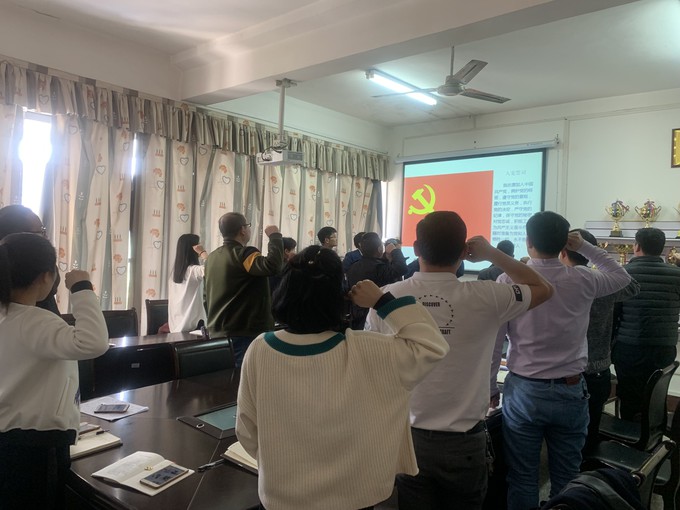 在支部主题党日活动阶段,全体党员交纳党费,重温入党誓词,学习相关文件精神,包括《中共中央关于加强党的政治建设的意见》《中国共产党重大事项请示报告条例》《关于加强和改进高校领导干部深入基层联系员工工作的通知》及中央和省委关于防治形式主义和官僚主义的相关文件、省委书记蒋超良在全省教育大会上的讲话精神。
