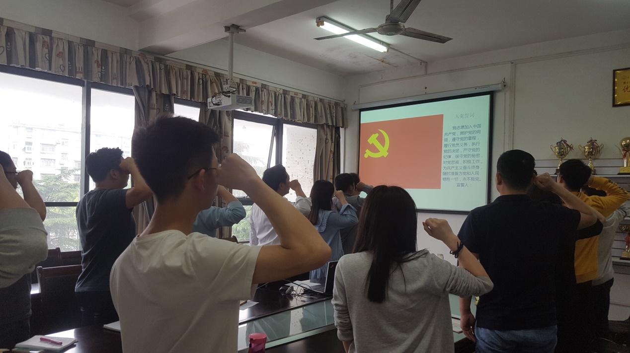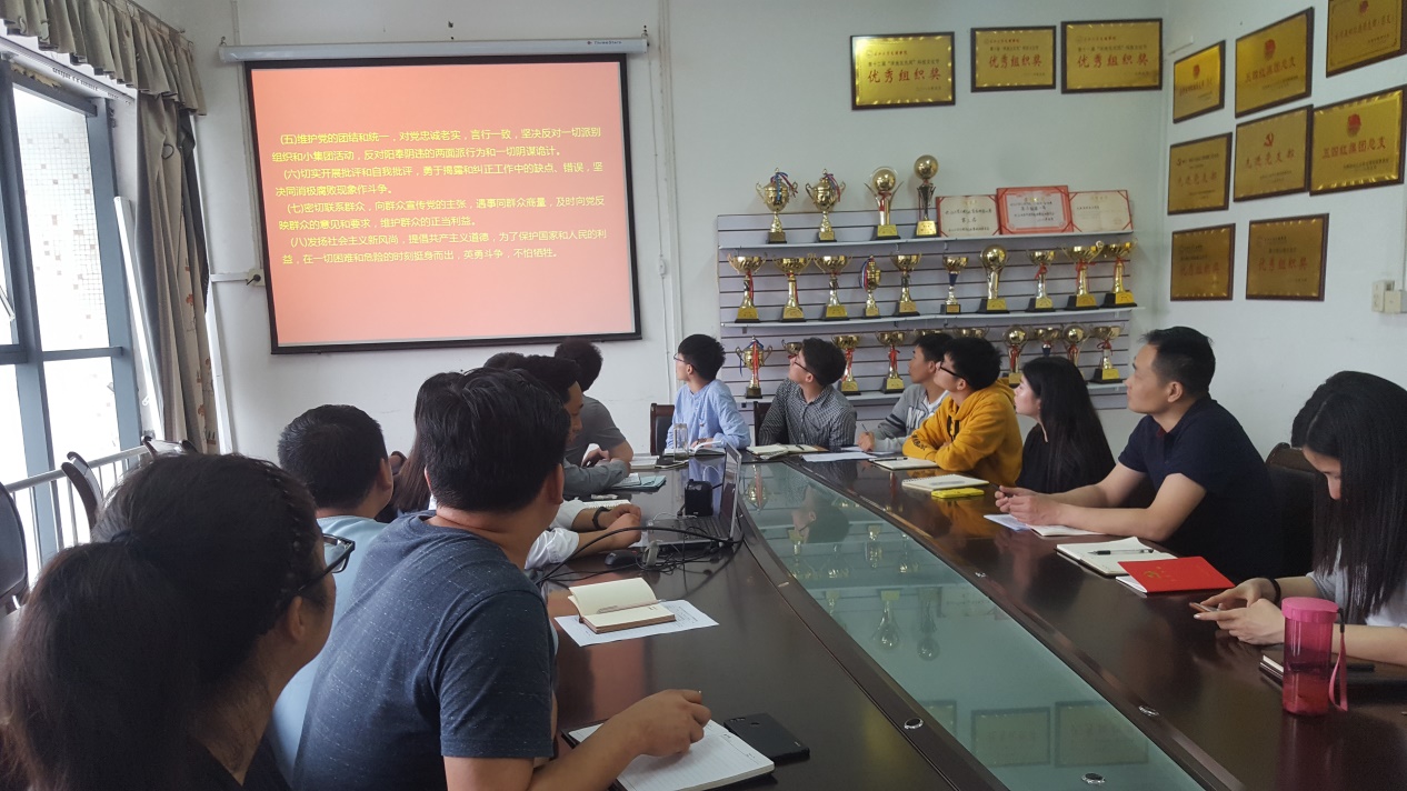 “支部主题党日”活动阶段,系党总支副书记辛裕组织了全体党员交纳党费,带领大家重温入党誓词、集体诵读党章第一章第三条(党员的义务),并以PPT形式重点学习了《中国共产党纪律处分条例》《中华人民共和国监察法》等相关文件精神。