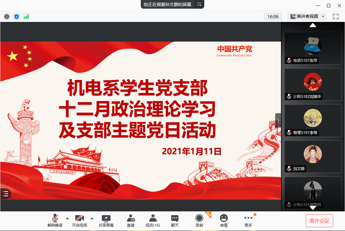 本网讯(员工记者 常伟)1月11日晚,在腾讯会议平台,我系员工党支部开展线上12月份政治学习、“支部主题党日”活动和2020年专题组织生活会暨民主评议党员会议。支部全体党员参加。