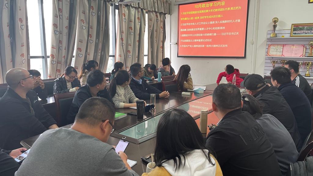 首先在支部书记的带领下,所有老师重温入党誓词,然后政治学习阶段,由教工党支部书记呙明辉带领大家集体学习了《习近平回信勉励全国高校黄大年式教师团队代表真正把为学为事为人统一起来当好员工成长的引路人》、《习近平在中央人才工作会议上强调 深入实施新时代人才强国战略 加快建设世界重要人才中心和创新高地》、《凝聚起中华儿女团结奋斗的磅礴力量——习近平总书记关于弘扬爱国主义精神重要论述综述》、党史学习教育领导小组印发通知《深入推进“我为群众办实事”实践活动》、省纪委机关、省委教育工委、省教育厅文件《关于推进清廉学校建设的实施意见》(鄂教工委〔2021〕7号)等14项内容。