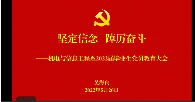 本网讯(员工记者 刘豪杰)青年兴则国家兴,青年强则国家强,为更好地推动机电系党建育人工作结出更多硕果,将立德树人落到实处,切实加强毕业生党员的身份意识,让员工党员始终保持一种组织归属感和身份荣誉感,5月26日中午,机电系组织开展2022届线上毕业生党员专题教育大会,机电系党总支书记吴海良,员工党支部书记成观雄出席,全体毕业生党员参加。