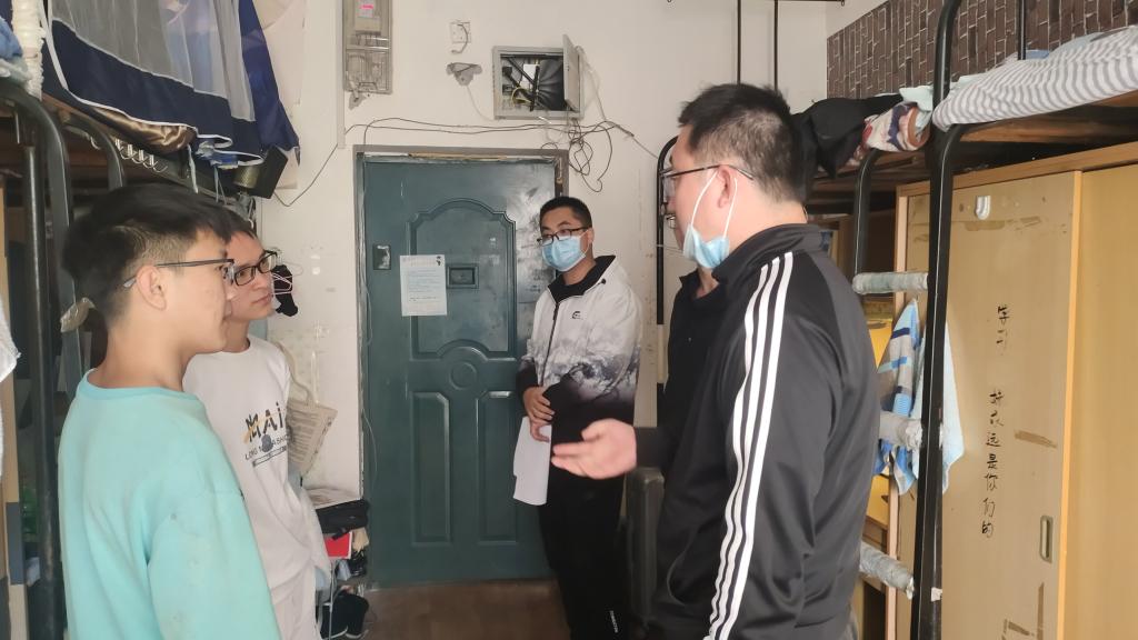 本网讯10月10日下午,机电系副主任呙明辉和辅导员朱亦丹深入员工寝室与同学们亲切交谈,要求员工严格遵守学校疫情防控政策,按时按点进行核酸检测,做好疫情防护,保护个人健康;仔细询问了员工上网课的情况,提醒同学们及时调整生活作息,认真上好网课;对于毕业班同学询问了其考研、就业情况,在疫情防控期间,珍惜时间,做好毕业论文的选题及撰写工作;用心叮嘱同学们注意安全用电,强化安全意识,注意维护宿舍卫生,营造温馨舒适的学习生活环境,以积极的心态面对疫情,加强身体锻炼和心理疏导,做到理解、支持、配合!相信荆州一定能战胜疫情!