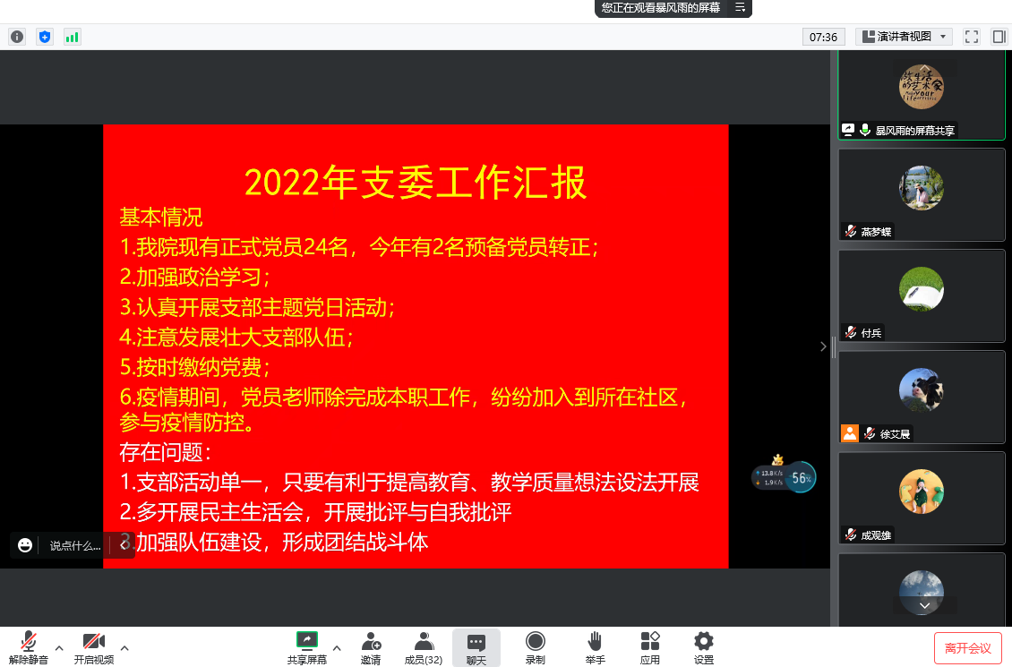 会议开始,呙明辉就2022年支委会工作开展汇报。本支部现有正式党员24名,全年2名预备党员转正,2名老师积极申请入党;本年度认真开展支部主题当日活动,持续壮大支部队伍;按时交纳党费;疫情期间,支部同志纷纷下沉社区,积极参与疫情防控。