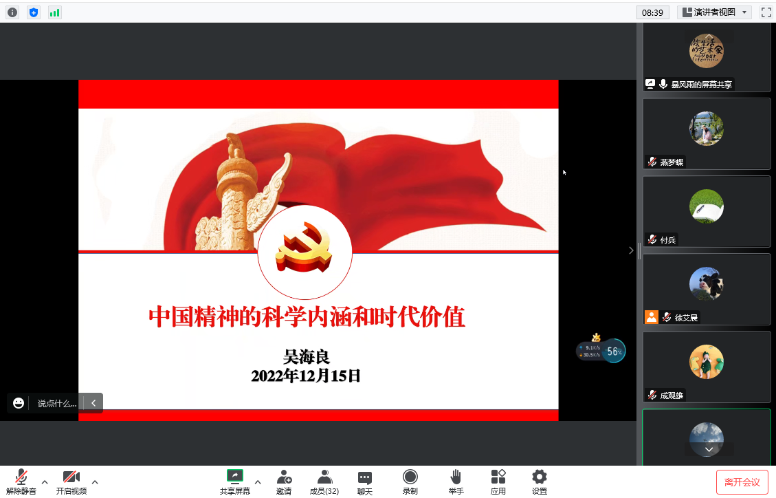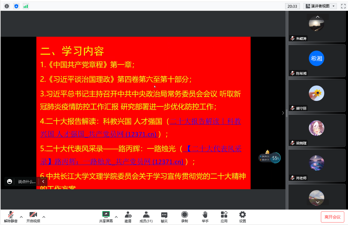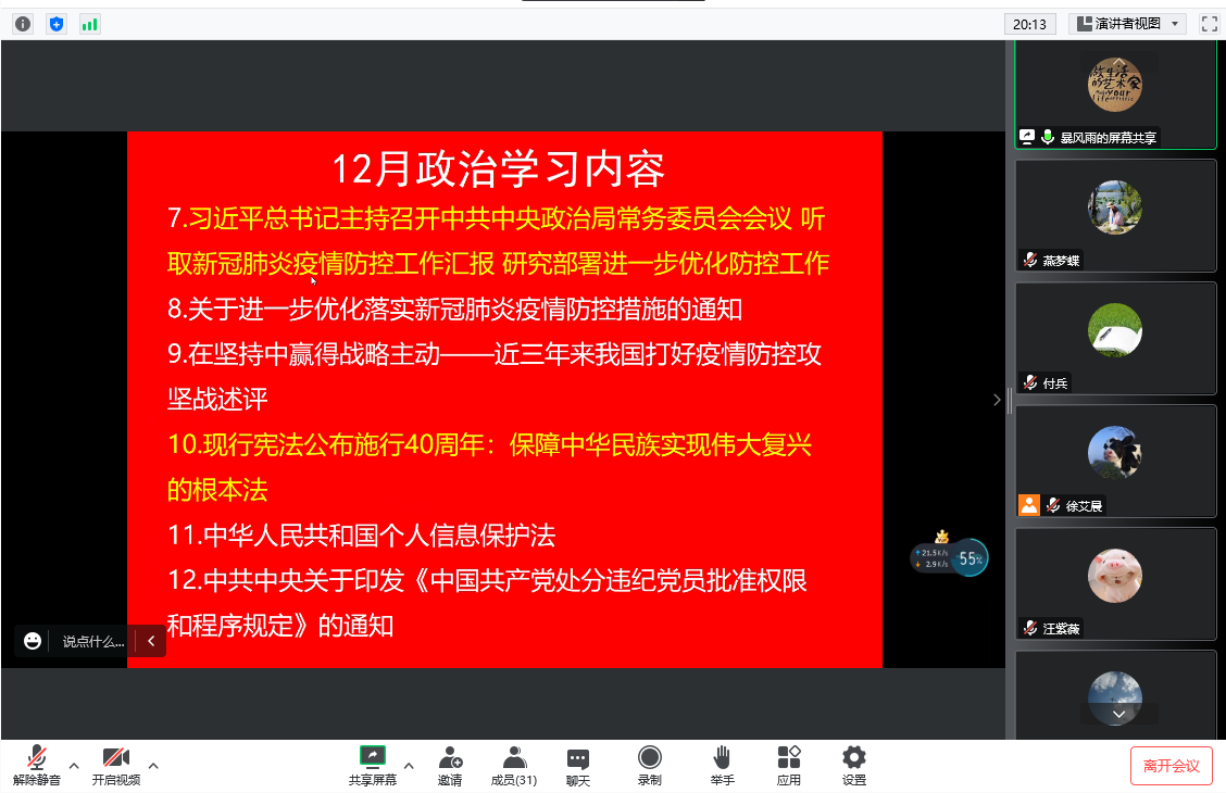 政治学习阶段,呙明辉带领大家集体学习党的二十大报告第五部分“实施科教兴国战略,强化现代化建设人才支撑”、党的二十大报告学习辅导百问、《习近平关于社会主义精神文明建设重要论述摘编》、《总体国家安全观学习纲要》内容解读、习近平总书记关于军民融合发展的重要论述、习近平在中央统战工作会议上的重要讲话;习近平总书记主持召开中共中央政治局常务委员会会议,听取新冠肺炎疫情防控工作汇报,研究部署进一步优化防控工作;关于进一步优化落实新冠肺炎疫情防控措施的通知;在坚持中赢得战略主动——近三年来我国打好疫情防控攻坚战述评;现行宪法公布施行40周年:保障中华民族实现伟大复兴的根本法;中华人民共和国个人信息保护法;中共中央关于印发《中国共产党处分违纪党员批准权限和程序规定》的通知等重要内容。