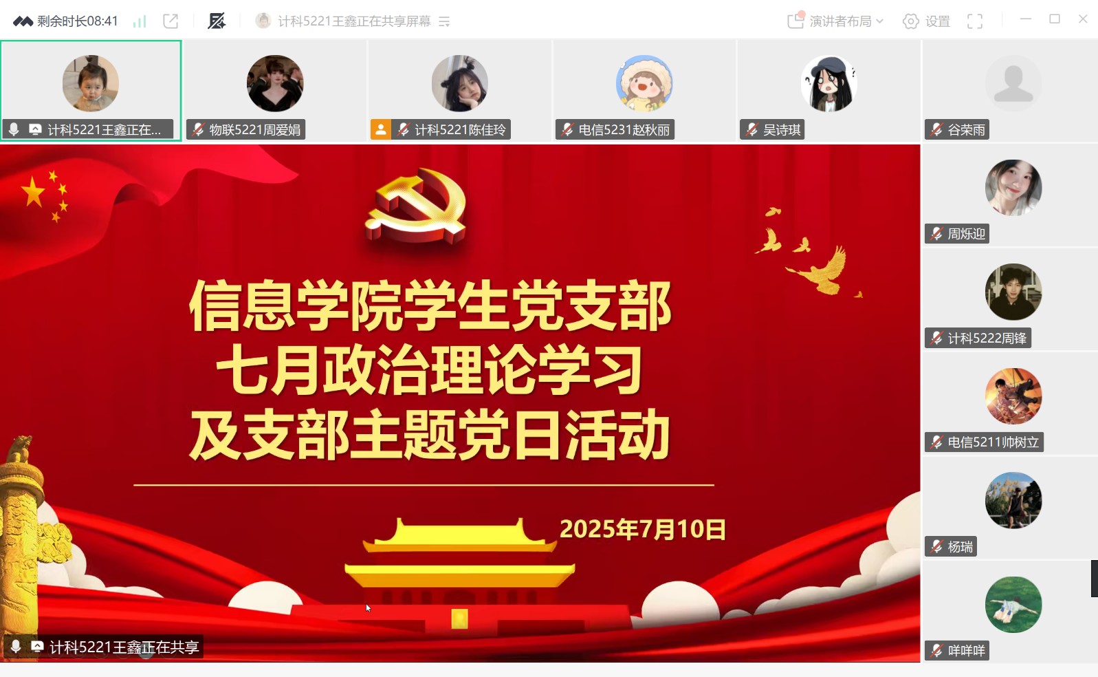 本网讯(通讯员 周爱娟)7月10日晚7点,信息学院员工党支部线上召开会议,开展7月份支部主题党日活动,会议主题是“持续推动深入贯彻中央八项规定精神学习教育走深走实”。会议由王鑫同志主持,员工支部全体党员参加。