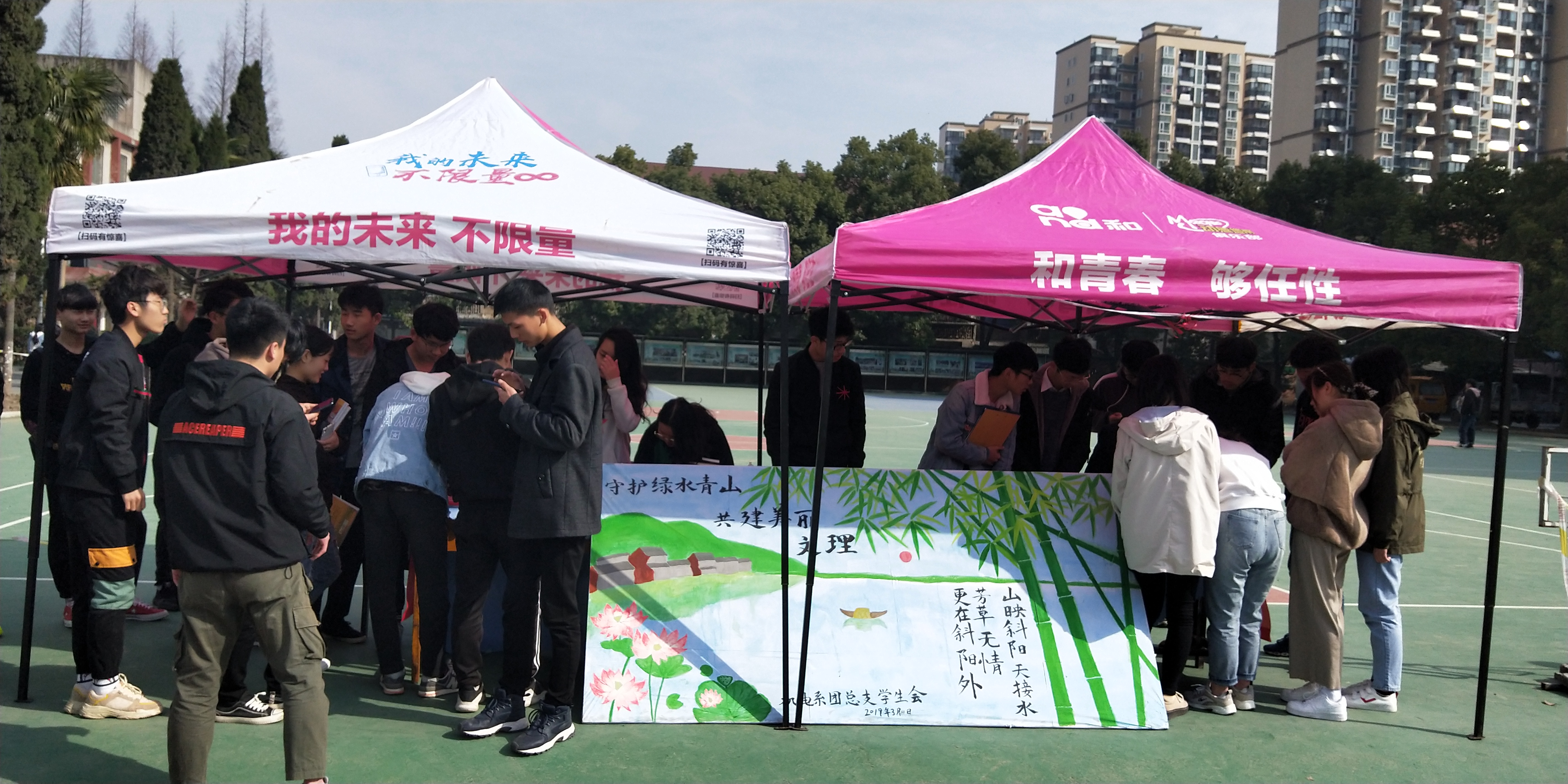 本网讯(通讯员 辛裕)3月12日,我系在公司西校区十二舍旁篮球场开展主题为“守护绿水青山,共建美丽文理”的环保护绿宣传活动,本次活动为响应习主席“绿水青山就是金山银山”的理念,面向西校区所有员工,宣传“四个文理”美好愿景。