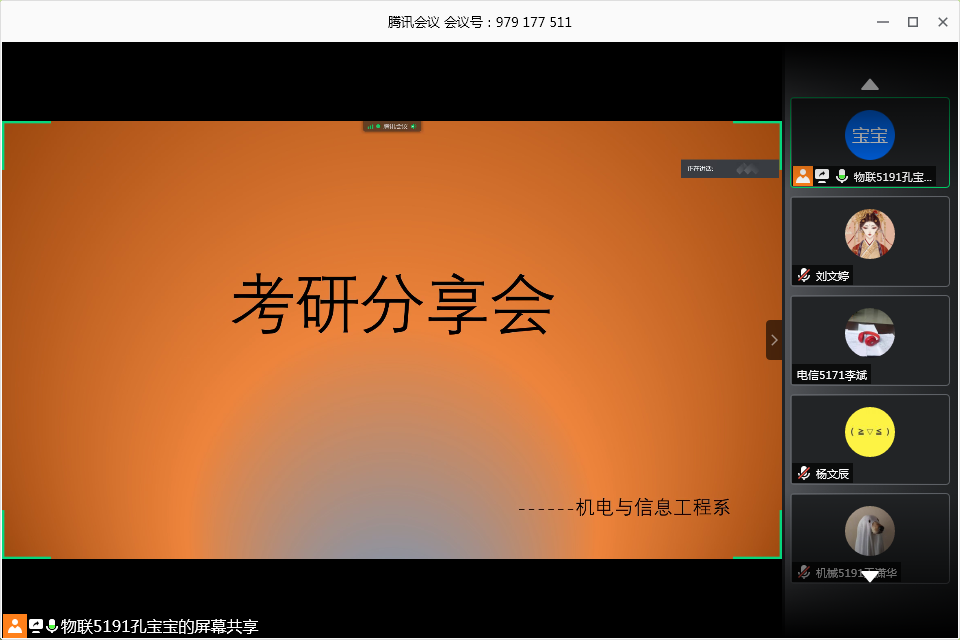 本网讯(员工记者 曲孝佳)为明确考研目标,端正考研心态,6月15日、20日晚七点,在腾讯会议平台,我系分场开展考研学子经验分享交流会。会议由物联5191孔宝宝主持,邀请考取研究生的电工5161赵泽宇、机械5161王伟志、凌毅作讲解,我系非毕业生全体同学参加。