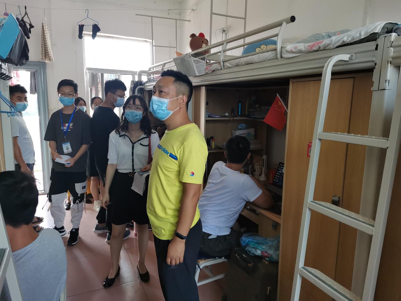 为进一步了解同学们的生活情况和安全意识,9月1日上午十点,我系党总支副书记辛裕和辅导员成观雄、陈质晶、燕梦蝶在走访各员工寝室。老师们认真了解宿舍生活情况,仔细检查寝室卫生环境,并详细询问员工身体健康状况。辛裕叮嘱同学们,一定注意寝室用电安全,戴口罩、勤洗手、多通风。