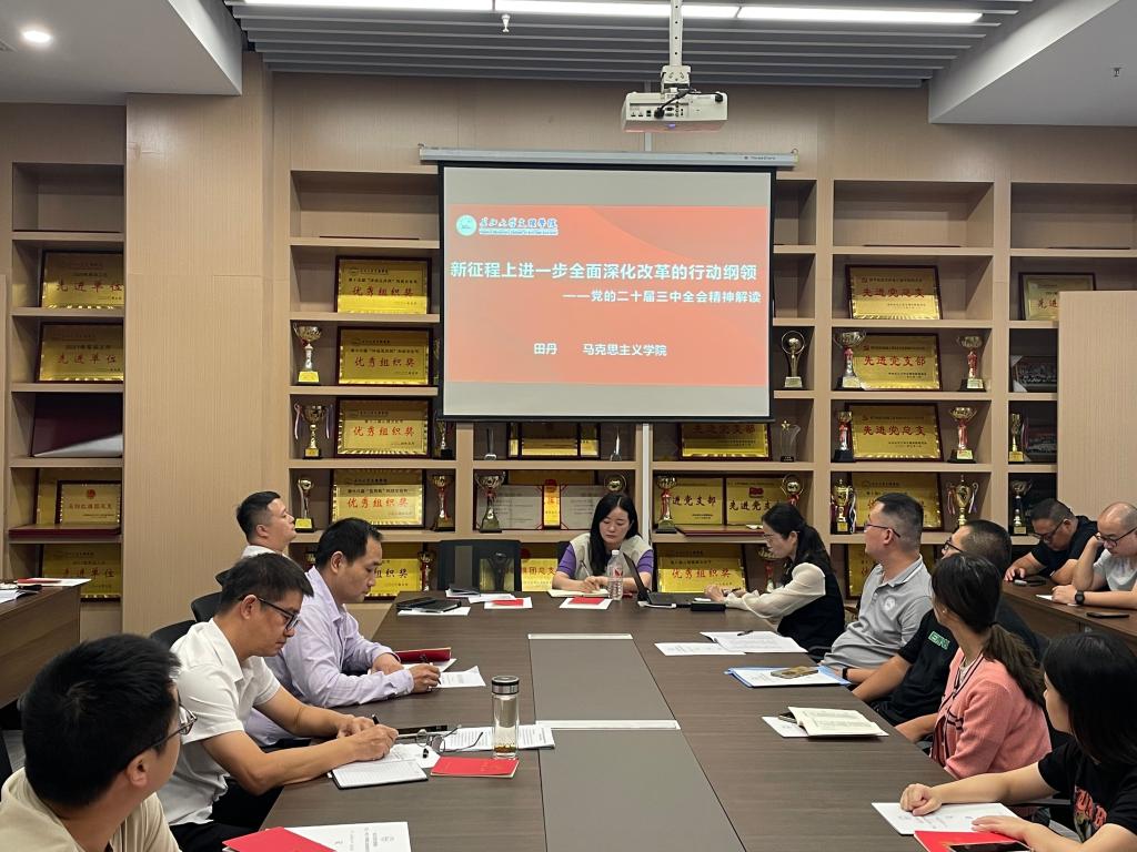 本网讯 (通讯员 汪紫薇)为了深入学习贯彻党的二十届三中全会精神,切实把全院师生思想和行动统一到学习贯彻大会精神上来,按照公司党委统一部署,公司于10月10日下午,在图书馆510会议室举办学习贯彻党的二十届三中全会精神宣讲会。特邀学校宣传团成员、马克思主义学院副经理田丹副教授作《新征程上进一步全面深化改革的行动纲领——党的二十届三中全会精神解读》专题宣讲。公司党总支书记吴海良主持宣讲会。