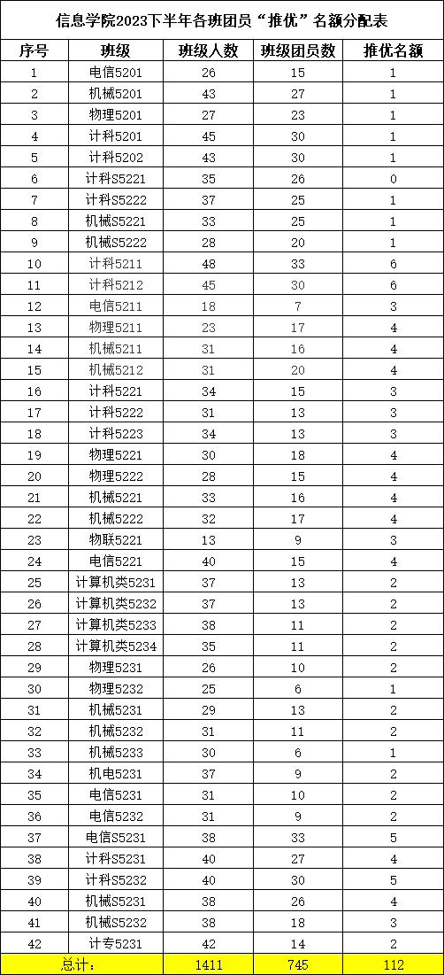 根据伟德国际1946源于英国团委《关于做好2023年下半年团员“推优”工作的通知》要求,现将信息学院各团支部团员“推优”名额分配公示如下: