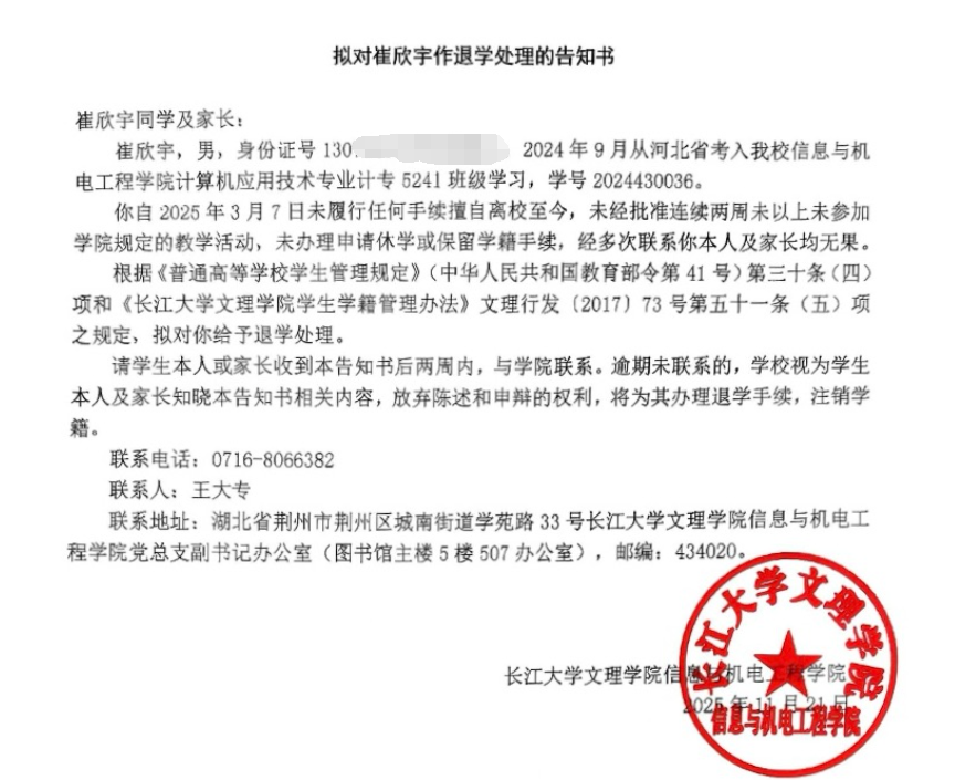 崔欣宇,男,学号2024430036。2024年9月从河北省考入公司信息与机电工程学院计算机应用技术专业计专5241班级学习。该生于2025年3月7日起未履行任何请假手续擅自离校,至今未返校;未经批准连续两周未参加学校规定的教学活动,也未办理申请休学或保留学籍手续;学院老师经多次联系员工本人和家长,均无果。