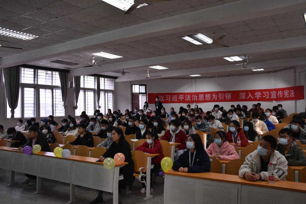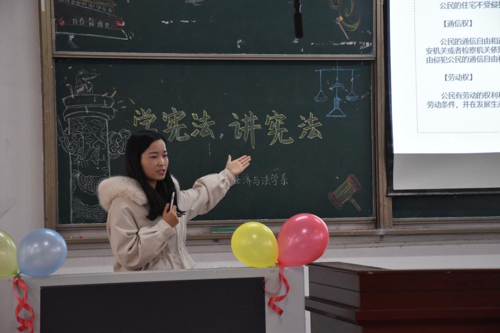 本网讯(员工记者 龚千惠 见习记者 陈燕妮 李雅雯)为弘扬宪法精神,在国家宪法日到来之际,本周五(123日)下午三点,经法系在4300举行了以“学宪法,讲宪法”为主题的宪法宣传日讲座。本次讲座由法学教研室姜婷婷老师为同学们讲解宪法知识。辅导员卢佳智参加活动,经法系全体员工党员、员工会成员和各班员工代表参加活动,活动由法学教研室主任周密老师主持。