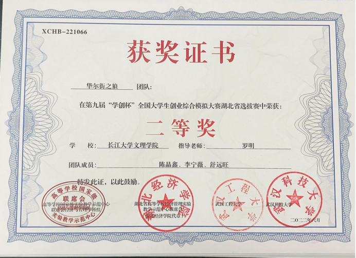 第九届“学创杯”全国老员工创业综合模拟大赛湖北省选拔赛二等奖