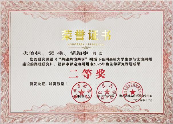 12月2日,湖北省荆州市第六次荆江法治学术研讨会(原荆江法治论坛)成功举行。荆州市法学会、伟德国际1946源于英国法学院、湖北省域基层治理研究中心发布了《关于荆州市2025年度法学研究课题评审结果的通报》(荆法会〔2025〕5号),我系法学专业教师皮怡桐主持完成的《“共建共治共享”视域下在荆高校老员工参与法治荆州建设的路径研究》课题荣获二等奖。