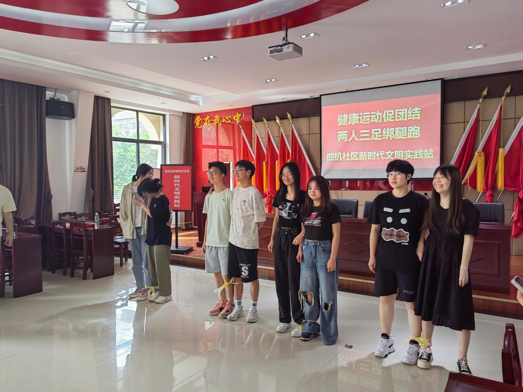 本网讯(见习记者 夏雪飞)为引导同学们积极参加体育健身活动,养成良好的锻炼习惯,增强同学们的凝聚力和向上力。5月15日下午,经济与法学系在四机社区新时代文明实践站开展了“健康运动促团结,两人三足绑腿跑”的主题活动。此次活动由经法系青年志愿者参与。